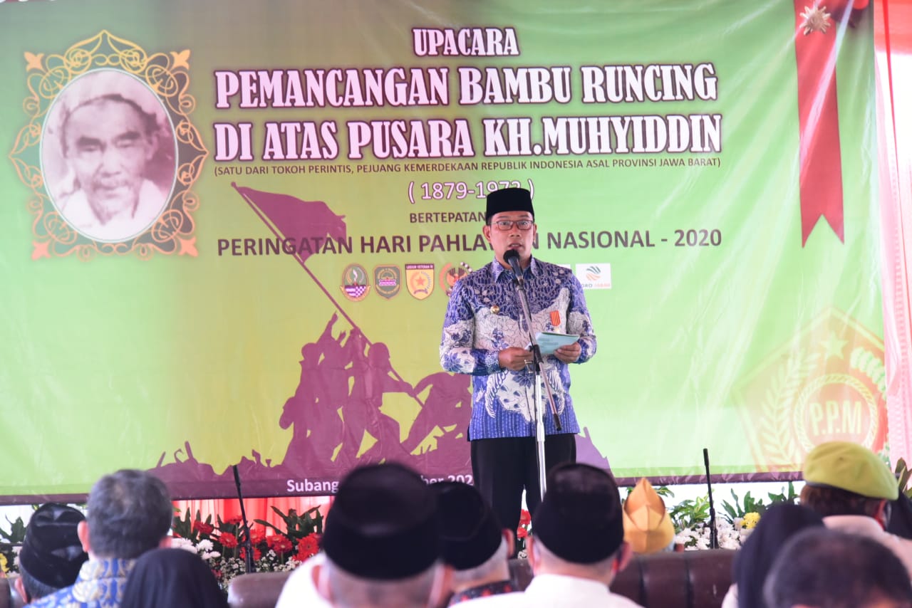 SUBANG – Gubernur Jawa Barat (Jabar) Ridwan Kamil menghadiri upacara pemancangan bambu runcing di Pusara KH. Muhyiddin di Pesantren Pagelaran, Kabupaten Subang, Rabu (11/11/2020). KH. Muhyiddin atau Mama Pagelaran merupakan pendiri Pesantren Pagelaran dan pejuang kemerdekaan.