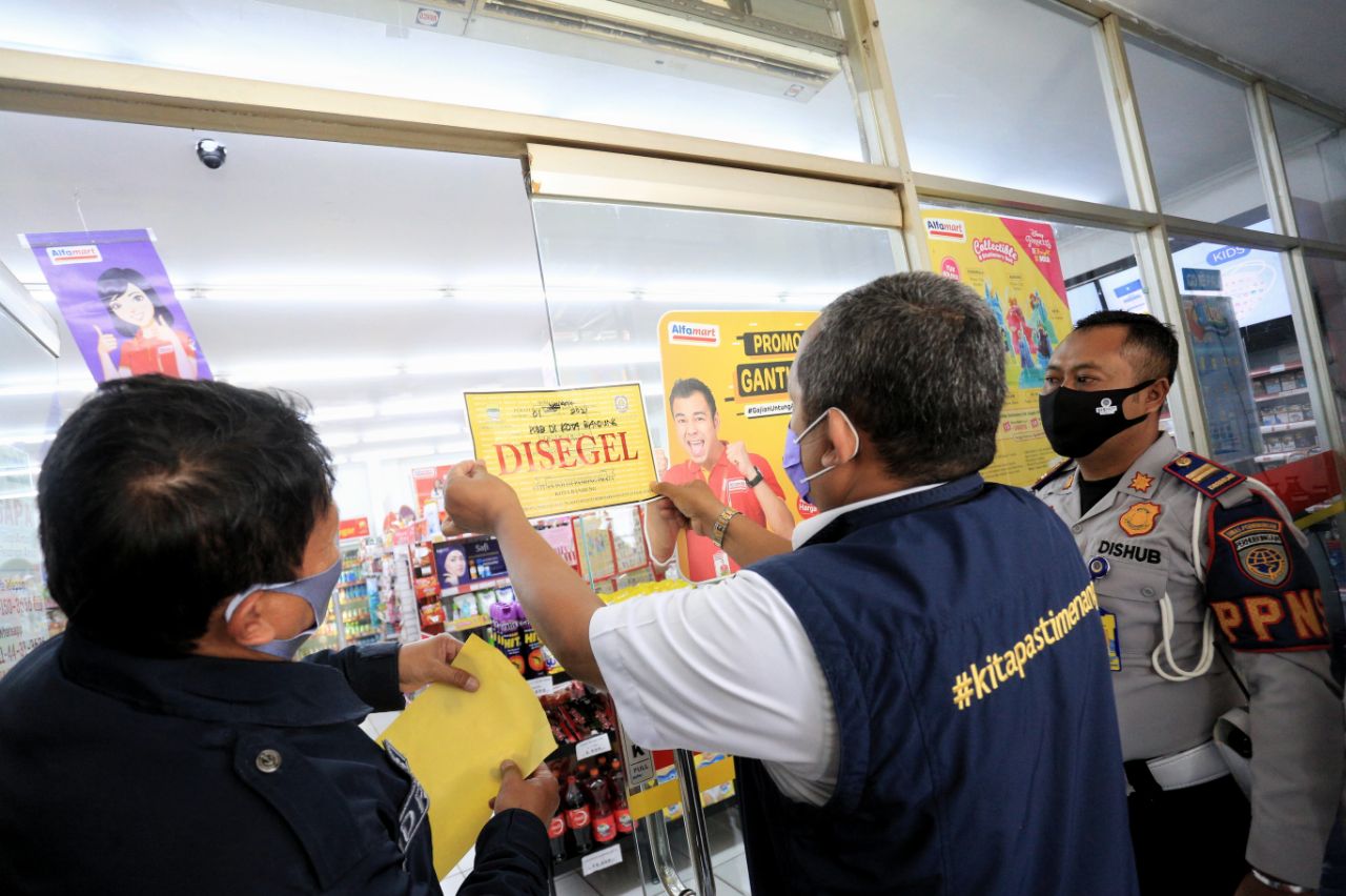 BANDUNG – Wakil Wali Kota Bandung, Yana Mulyana bersama Satuan Tugas (Satgas) Penanganan Covid-19 Kota Bandung menyegel 4 mini market di Jalan R.E Martadinata (Riau) dan Gatot Subroto. ke empat mini market ini disegel karena melanggar aturan PSBB.