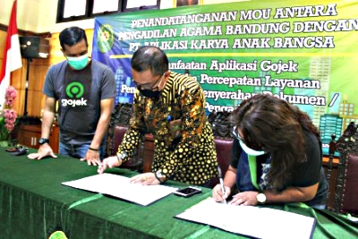 Bandung, — PENGADILAN Agama Bandung kembali tunjukan komitmennya untuk terus meningkatkan pelayanan dengan menggandeng PT. Aplikasi Karya Anak Bangsa (Gojek) yang merupakan perusahaan aplikasi pertama di Jawa Barat dengan menandatangani nota kesepahaman bersama (MoU) di Kantor Pengadilan Agama Bandung, Selasa, (12/10/2020).