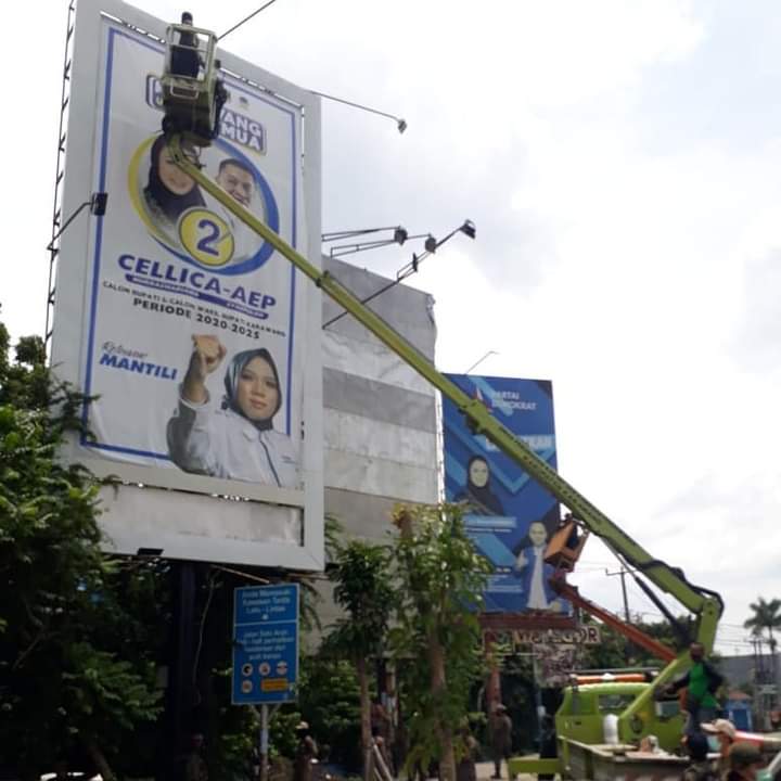 KARAWANG – Tim gabungan dari Satpol PP Karawang dan Bawaslu Karawang menertibkan ratusan Bahan Kampanye (BK) dan Alat Peraga Kampanye (APK) calon Bupati dan Wakil Bupati yang ditempatkan tidak sesuai aturan. Kamis, 12 November 2020.