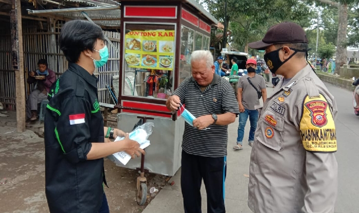 Kegiatan tersebut dilaksanakan di Tugu Baleendah Polsek Baleendah Polresta Bandung bersama tiga pilar, sebanyak 500 masker dibagikan gratis kepada pengguna jalan untuk meminimalisir penyebaran virus Corona