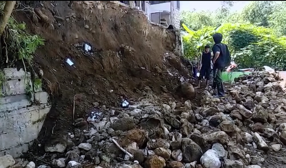 KAB. CIANJUR,- Tembok penahan tanah (TPT) sepanjang 15 meter dan tinggi 3 meter yang berada di depan bangunan rumah milik keluarga Solihin (27) warga Kampung Legok RT 02 /07 Desa Bunikasih, Kecamatan Warungkondang, Kabupaten Cianjur, Jawa Barat, Minggu (13/6/2021) sekira Pukul 01.00 WIB mengalami longsor hingga teras dan bangunan bagian depan rumah ambrol.