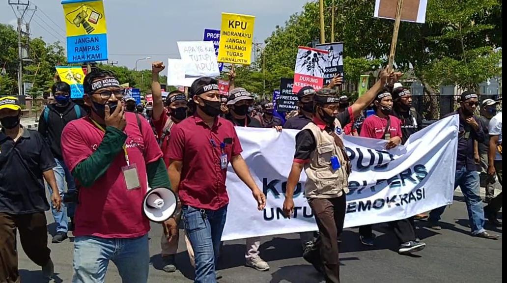 Menyebut diri Koalisi Pers Untuk Demokrasi (KPUD), para jurnalis mendatangi Kantor KPU Indramayu setelah sebelumnya menggelar long march dari Islamic Center setempat. Aksi itu pun diiringi kesenian tradisional kuda lumping dan berokan.