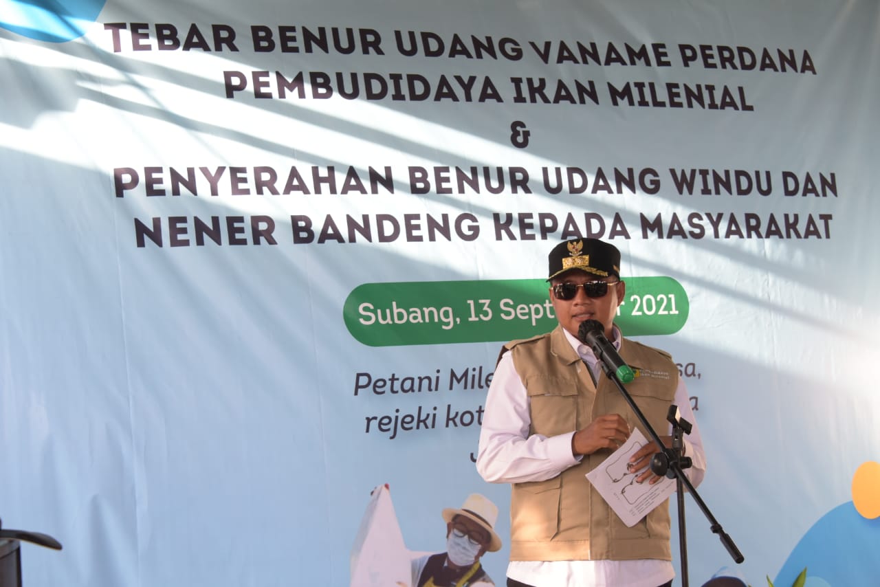 SUBANG – Wakil Gubernur (Wagub) Jawa Barat (Jabar) Uu Ruzhanul Ulum meresmikan Pembudidaya Ikan Milenial (PIM) Udang Vaname di Muara Blanakan, Kabupaten Subang, Senin (13/9/2021). Ada empat PIM yang akan membudidayakan udang vaname.