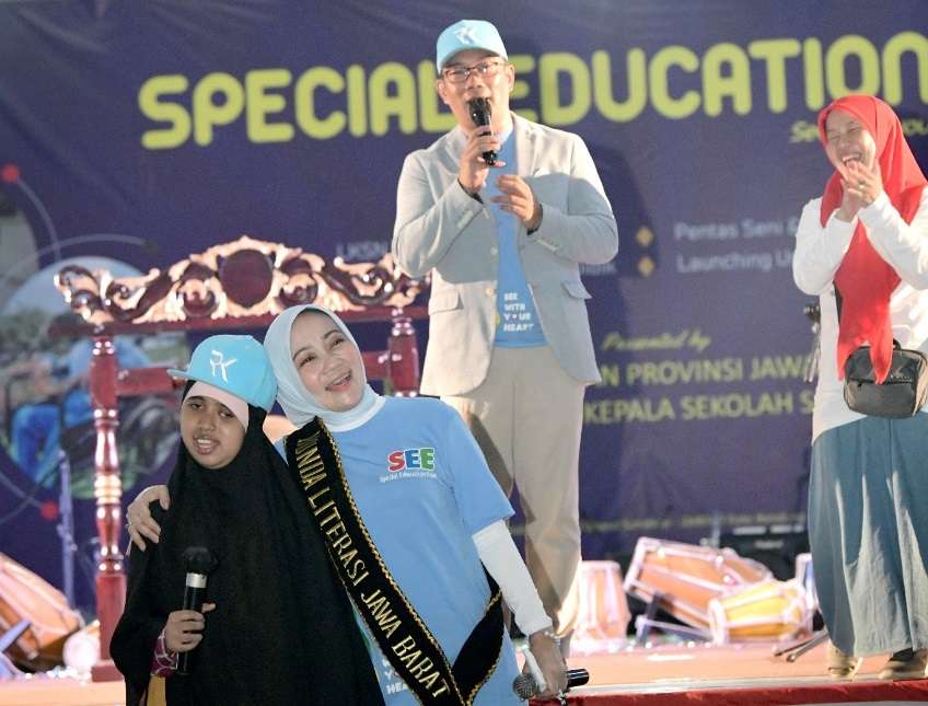 Setelah membuka acara, Kang Emil — sapaan Ridwan Kamil — sempat berbincang dengan seorang guru honorer bernama Sulasman yang telah mengabdikan hidupnya selama 32 tahun di SLB Kota Bandung.