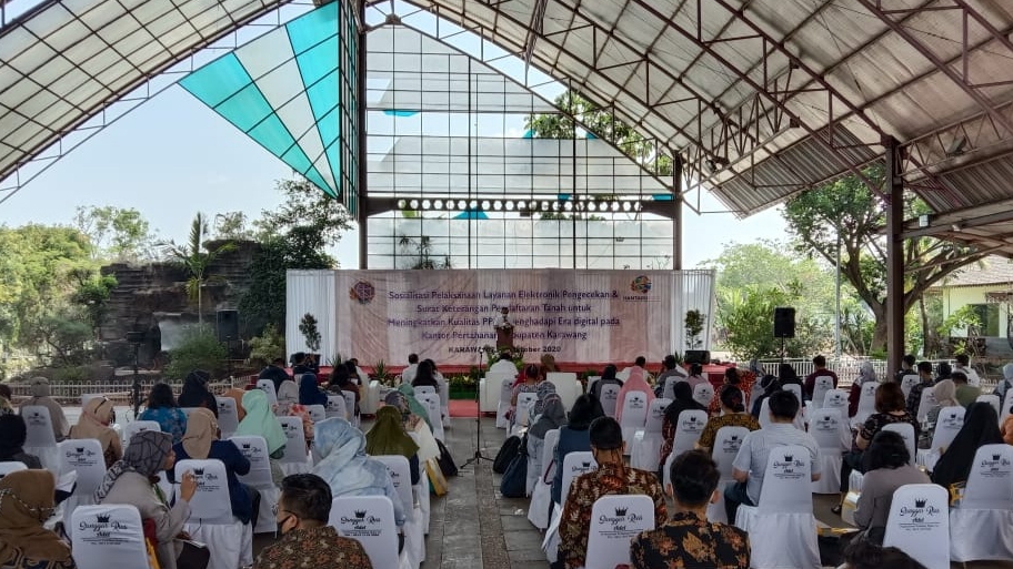 KARAWANG-Kantor Pertanahan Kabupaten Karawang Sosialisasi Pelaksanaan Layanan Elektronik Pengecekan dan Surat Keterangan Pendaftaran Tanah Untuk Meningkatan Kualitas PPAT Untuk Menghadapi Era Digital, Acara tersebut dikuti 150 peserta dan bertempat di Rumah Makan Indo Alamsari Karawang Barat, Rabu (14/10/20).