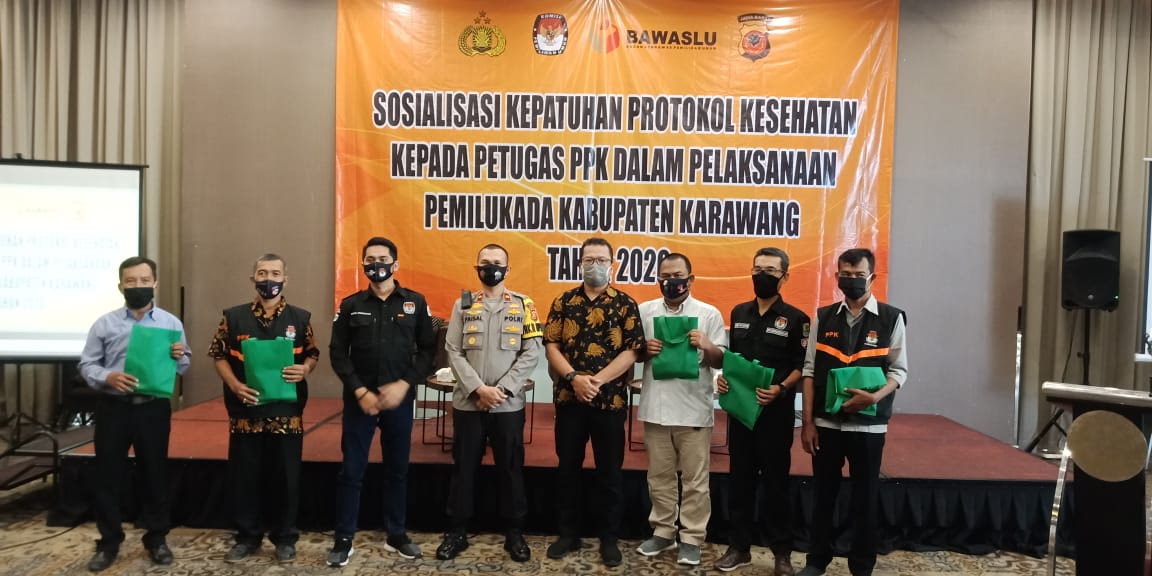 KARAWANG- Polres Karawang menggelar kegiatan sosialisasi kepatuhan protokol kesehatan kepada petugas Panitia Pemilihan Kecamatan (PPK) se-Kabupaten Karawang dalam pelaksanaan pemilukada Tahun 2020, di Brits Hotel, Grand Taruma, Telukjambe Timur, Karawang, Jawa Bara, Rabu (14/10/20) pagi.
