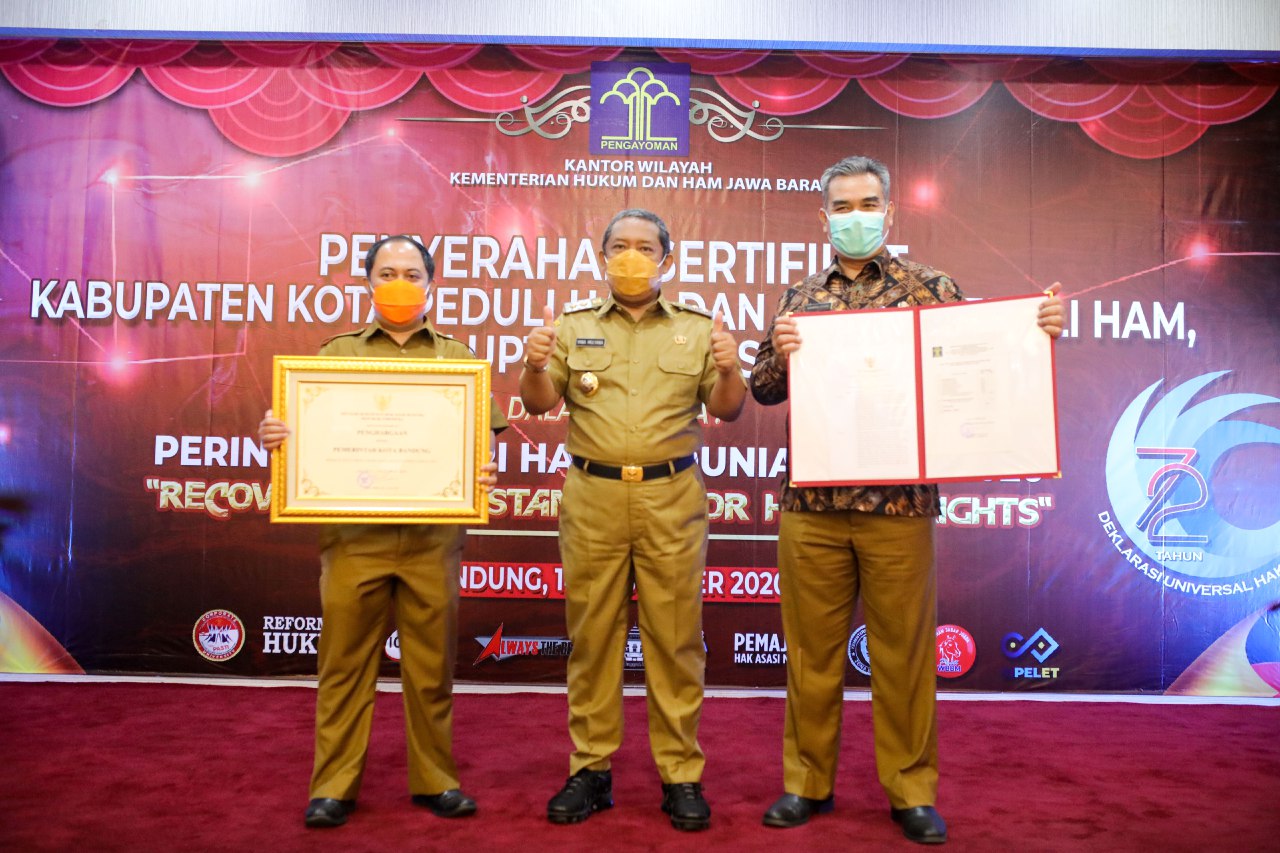 BANDUNG – Pemerintah Kota (Pemkot) Bandung kembali mendapatkan penghargaan sebagai Kota Peduli Hak Asasi Manusia (HAM) dari Menteri Hukum dan Ham Republik Indonesia Yasonna H. Laoly.