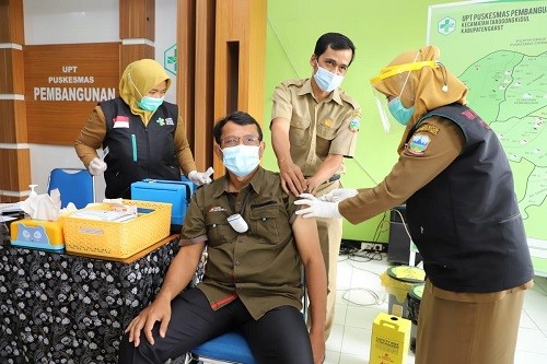 GARUT, Tarogong Kidul – Wakil Bupati Garut dr. Helmi Budiman menjalani vaksinasi Covid-19 tahap kedua di Puskesmas Pembangunan, Kecamatan Tarogong Kidul, Kabupaten Garut, Senin (15/2/2021).