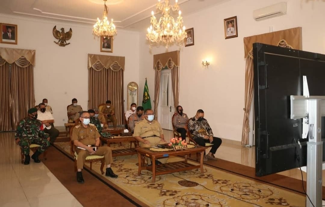 KAB. SUKABUMI,- Bupati Sukabumi H. Marwan Hamami mengikuti rapat koordinasi nasional kepala daerah hasil pilkada serentak taun 2020 yang dibuka secara resmi oleh Presiden RI Joko Widodo melalui video conference bertempat di Pendopo Sukabumi, Jawa Barat Rabu (14/4).
