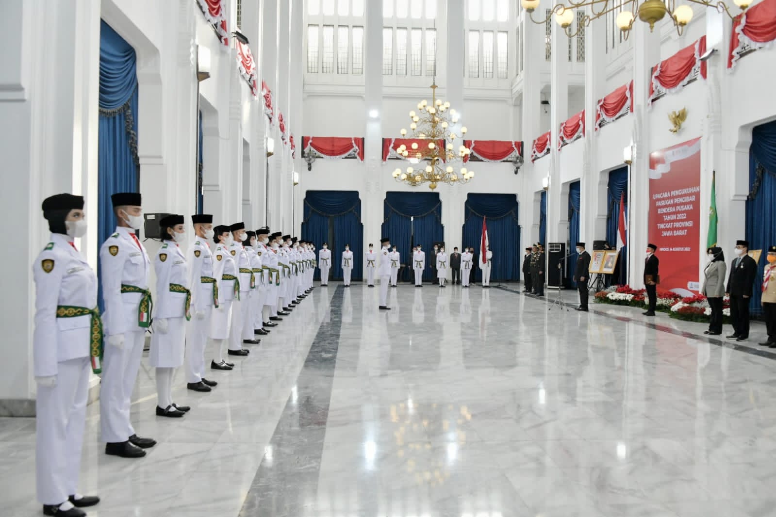 Upacara pengukuhan kepada 54 anggota Paskibraka terpilih dari berbagai daerah di Jabar ini digelar di Aula Barat Gedung Sate, Kota Bandung, Minggu (14/8/2022).