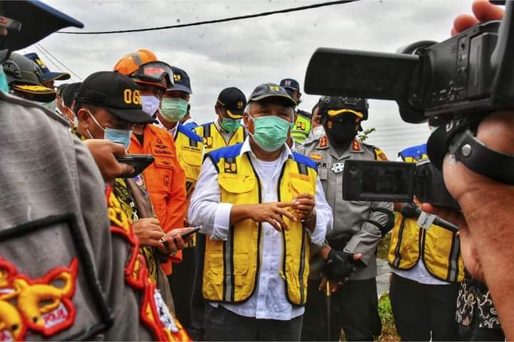 SUMEDANG – Menteri Pekerjaan Umum dan Perumahan Rakyat (PUPR) Republik Indonesia Basuki Hadimuljono meninjau langsung lokasi longsor di Desa Cihanjuang Kecamatan Cimanggung Kabupaten Sumedang, Kamis (14/1/2021)