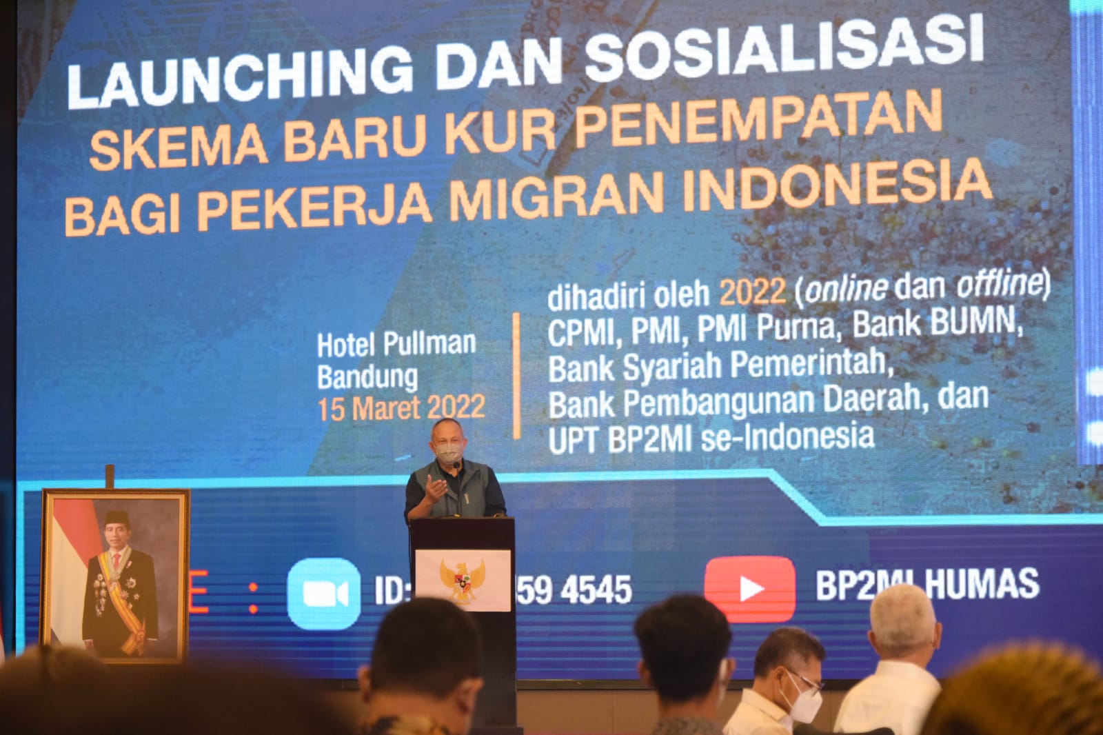 BANDUNG – Sekretaris Daerah Provinsi Jawa Barat Setiawan Wangsaatmaja menyosialisasikan skema baru Kredit Usaha Rakyat (KUR) Penempatan bagi Pekerja Migran Indonesia (PMI) di Pullman Hotel, Kota Bandung, Selasa (15/3/22).