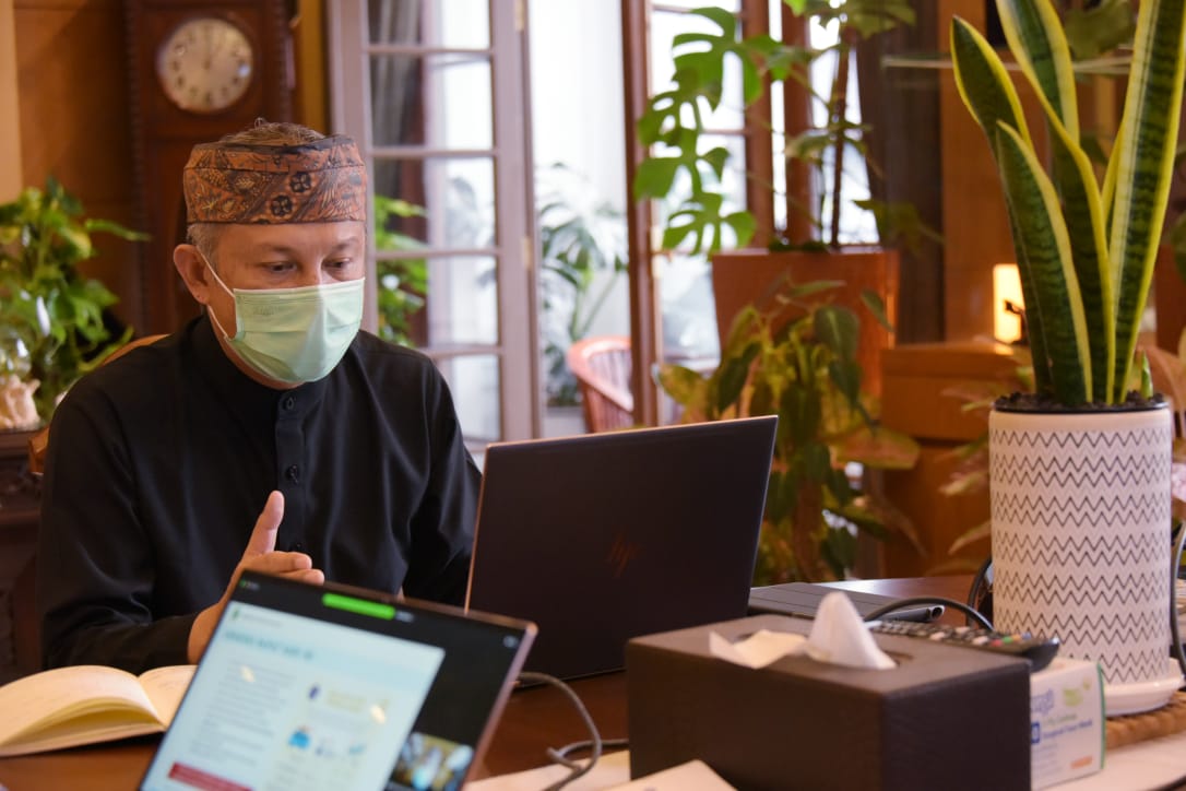 Sekda Provinsi Jabar Setiawan Wangsaatmaja saat menghadiri Rakor Lintas Provinsi untuk Tindak Lanjuti Larangan Mudik via video konferensi dari Gedung Sate, Kota Bandung, Kamis (15/4/2021). (Foto: Yana/Biro Adpim Jabar)