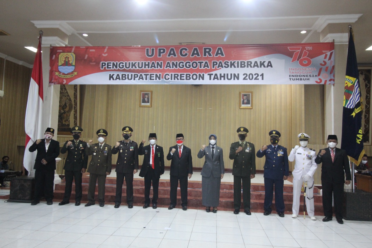 KABUPATEN CIREBON – Bupati Cirebon, Drs. H. Imron, M.Ag mengukuhkan 40 Pasukan Pengibar Bendera Pusaka (Paskibraka) Kabupaten Cirebon tahun 2021 di ruang Nyimas Gandasari Kantor Setda, Minggu (15/8/2021).