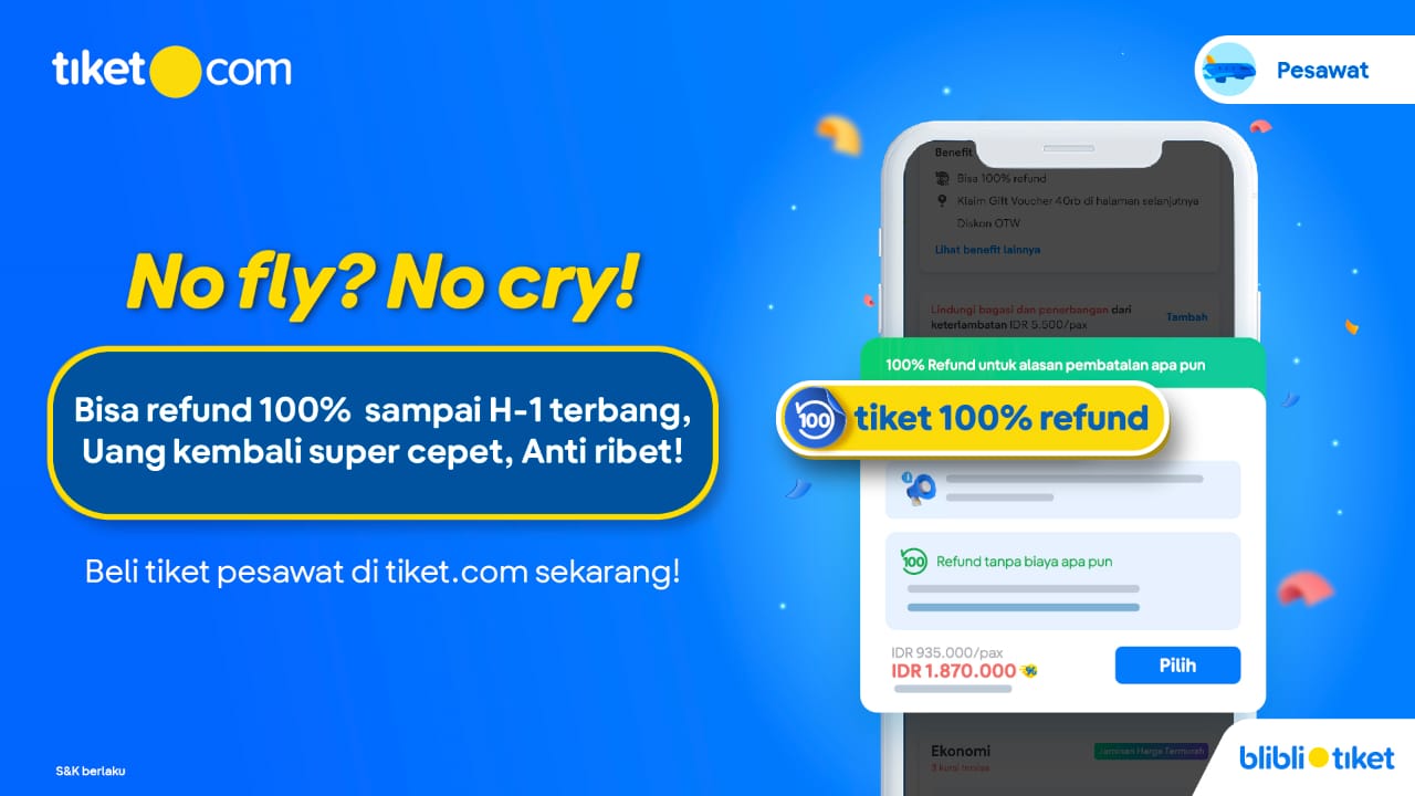 Sobat tiket bisa mendapatkan refund 100% dalam bentuk limit kartu kredit, Blipay, maupun Paylater dengan cepat dan tentunya bisa menjadi solusi ketika liburan tidak berjalan sesuai rencana. Dengan proses klaim-nya yang mudah, sekarang beli tiket pesawat jadi less worry, no fly no cry! Informasi lebih lanjut dapat diakses pada tautan berikut https://www.tiket.com/info/tiket-100-persen-refund.