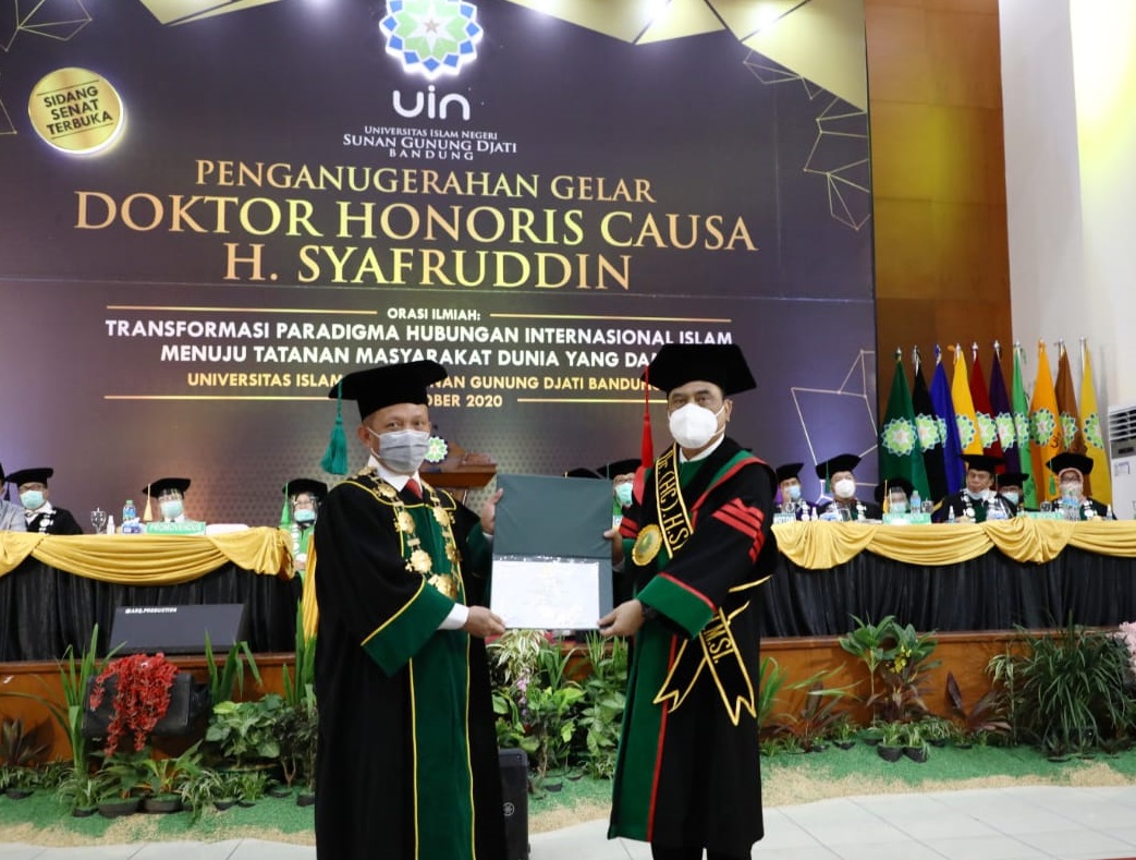 BANDUNG – Mantan Wakil Kepolisian RI Komjen Pol (Purn) Syafruddin, mendapatkan gelar Doktor Honoris Causa (HC) melalui sidang terbuka Universitas Islam Negeri (UIN) Sunan Gunung Djati, di gedung Anwar Musaddad yang disiarkan secara langsung melalui kanal Youtube, Kamis (15/10/2020).