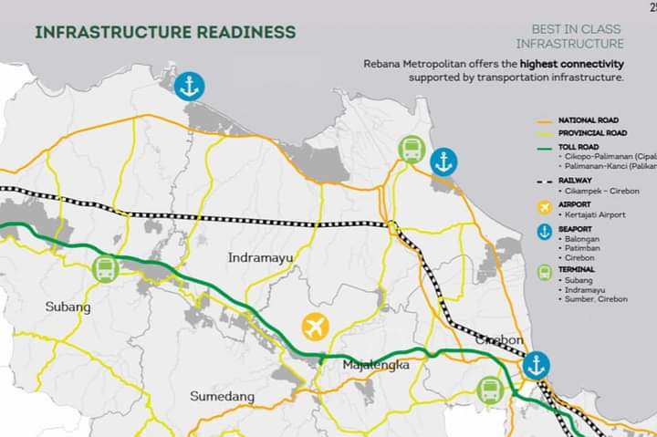 Adapun saat ini, dukungan infrastruktur yang sudah ada di kawasan Rebana Metropolitan antara lain jalan nasional, Tol Cikopo-Palimanan (Cipali) dan Palimanan-Kanci (Palikanci), rel Cikampek-Cirebon, Pelabuhan Balongan, Cirebon, dan Patimban (Tahap I), BIJB Kertajati, serta terminal Subang, Indramayu, dan Cirebon. Kebutuhan energi juga tersedia, antara lain lewat dam di Cipancuh, Jatigede, dan Setupatok, kilang minyak Balongan, geothermal di Ciremai, hydro power Jatigede, hingga PLTU di Indramayu.