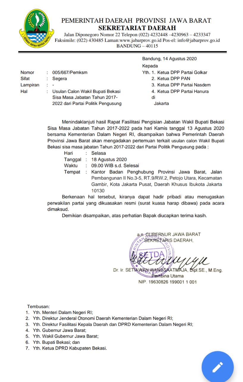 Surat tersebut ditujukan kepada seluruh ketua umum partai koalisi pengusung (Ketua umum DPP Partai Golkar, Ketua Umum DPP Nasdem, Ketua Umum DPP PAN, Ketua Umum DPP Hanura), untuk hadir pada hari Selasa 18 Agustus 2020 di Kantor Badan Penghubung Provinsi Jawa Barat jalan Pembangunan II No.3-5, RT 9 RW 2, Petojo Utara Kecamatan Gambir, Kota Jakarta Pusat, Daerah Khusus Ibu Kota Jakarta.
