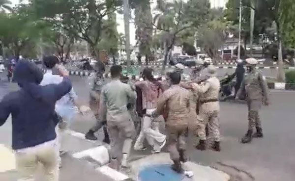 Para mahasiswa terlibat baku hantam dengan sejumlah aparat keamanan yang bertugas untuk menjaga aksi tersebut. Informasi yang diterima, kericuhan ini bermula dari saling dorong diantara kedua belah pihak tak lama setelah para mahasiswa menyuarakan tuntutannya.