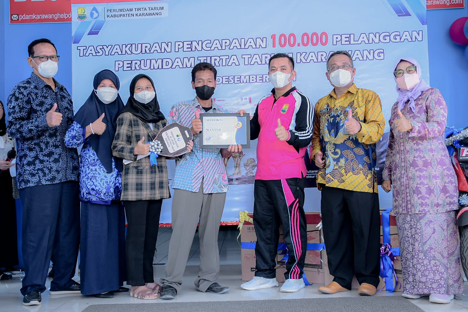 Hadiah KejutanSebagai wujud syukur atas capaian tersebut Perumdam Tirta Tarum Karawang memberikan kejutan hadiah1 (satu) buah motor matik untuk pelanggan ke-100.000 yang diserahkan secara langsung oleh Bapak Wakil Bupati Karawang H. Aep Saepuloh SE di halaman Perumdam Tirta Tarum Karawang pada Jum’at 17 Desember 2021.