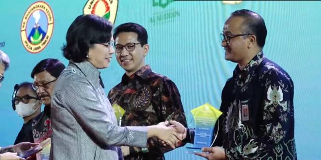Kepala BBSPJIBBT atau B4T Junadi Marki saat menerima penghargaan Pengelolaan BLU Award yang diserahkan Menteri Keuangan (Menkeu) Sri Mulyani Indrawati pada Rapat Koordinasi (Rakor) BLU yang bertajuk BLU Inklusif Indonesia Optimis di Gedung Dhanapala Kemenkeu, Jakarta, Kamis (2/3/2023).