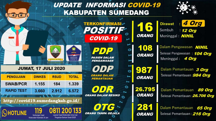 SUMEDANG, — Gugus Tugas Percepatan Penanganan Covid-19 Kabupaten Sumedang kembali melaporkan perkembangan pencegahan penyebaran Covid-19 di Kabupaten Sumedang pada Selasa, 14 Juli 2020 yang masih perlu lebih diwaspadai.