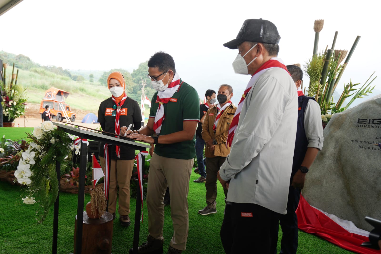 Ketua Kwarda Pramuka Jawa Barat Atalia Praratya Ridwan Kamil menyaksikan peletakan batu pertama itu. Atalia sempat mencoba menaiki mobil landrover defender miliki eiger. Kemudian Atalia juga sempat mendampingi Sandiaga Uno untuk mencicipi kopi eiger dan menanam pohon.
