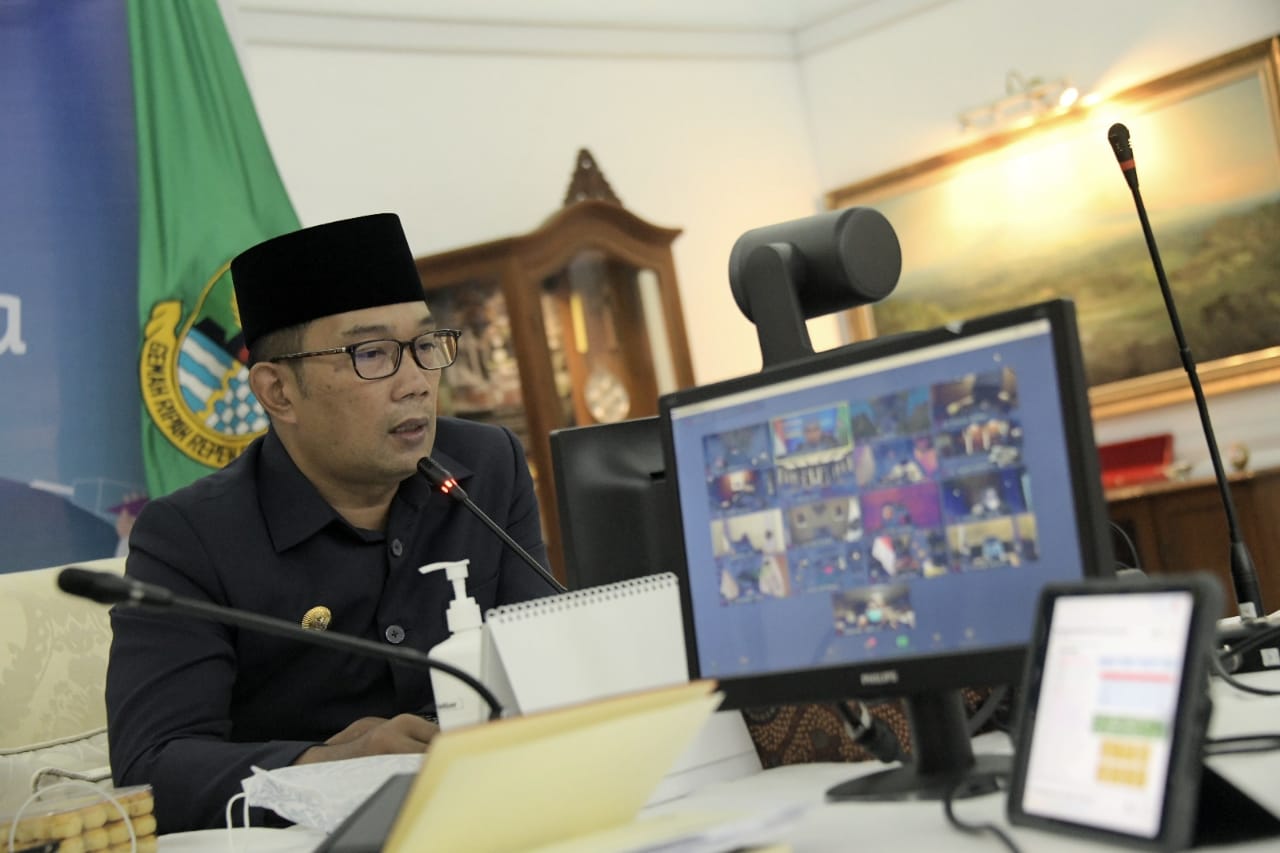 BANDUNG – Gubernur Jawa Barat (Jabar) Ridwan Kamil mengikuti rapat koordinasi pembahasan perkembangan Pemberlakuan Pembatasan Kegiatan Masyarakat (PPKM) Mikro bersama Menteri Koordinator (Menko) Bidang Perekonomian Republik Indonesia (RI) Airlangga Hartarto via konferensi video dari Gedung Pakuan, Kota Bandung, Kamis (18/2/2021).