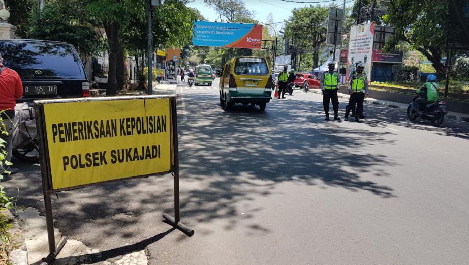 Terlihat beberapa petugas kepolisian melakukan pengecekan terhadap mobil berplat luar Kota Bandung seperti B, T, F dan yang lainnya.