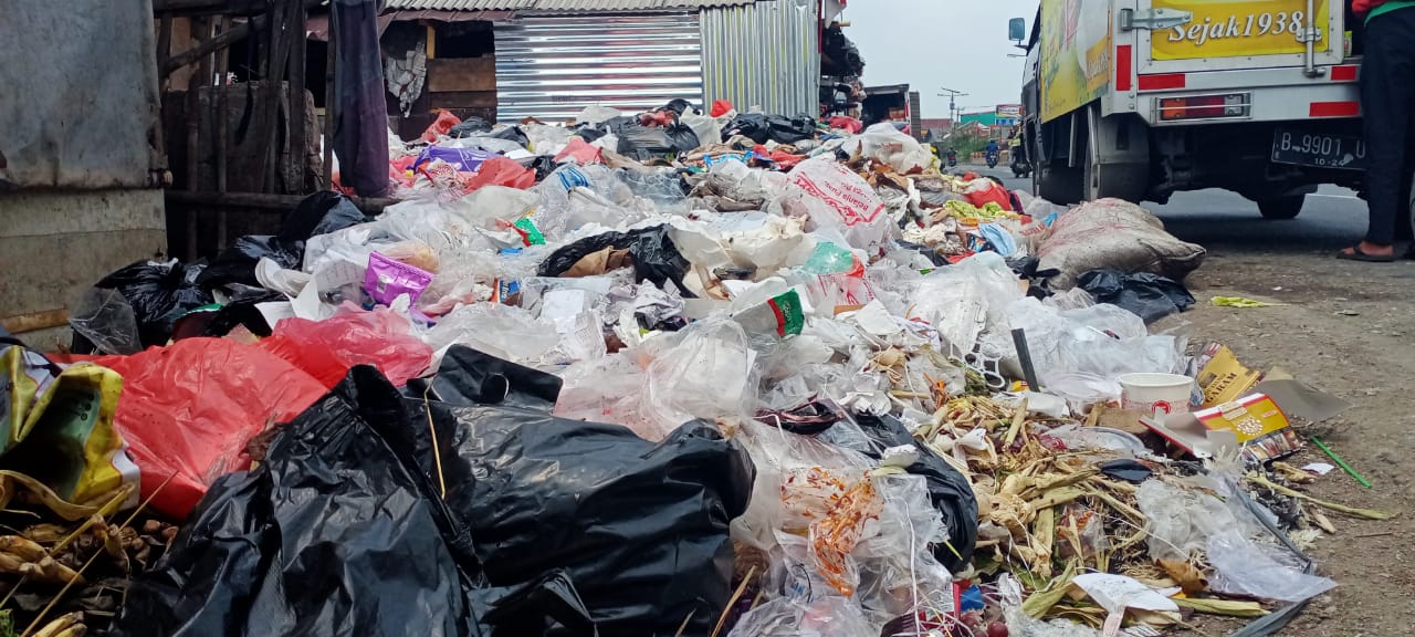 Pantauan di lokasi, tumpukan sampah meluber hingga menutupi jalan, bahkan ada sebagian sampah sudah menyatu dengan jalan yang berdampak bongkar muat barang masuk ke pasar terganggu.