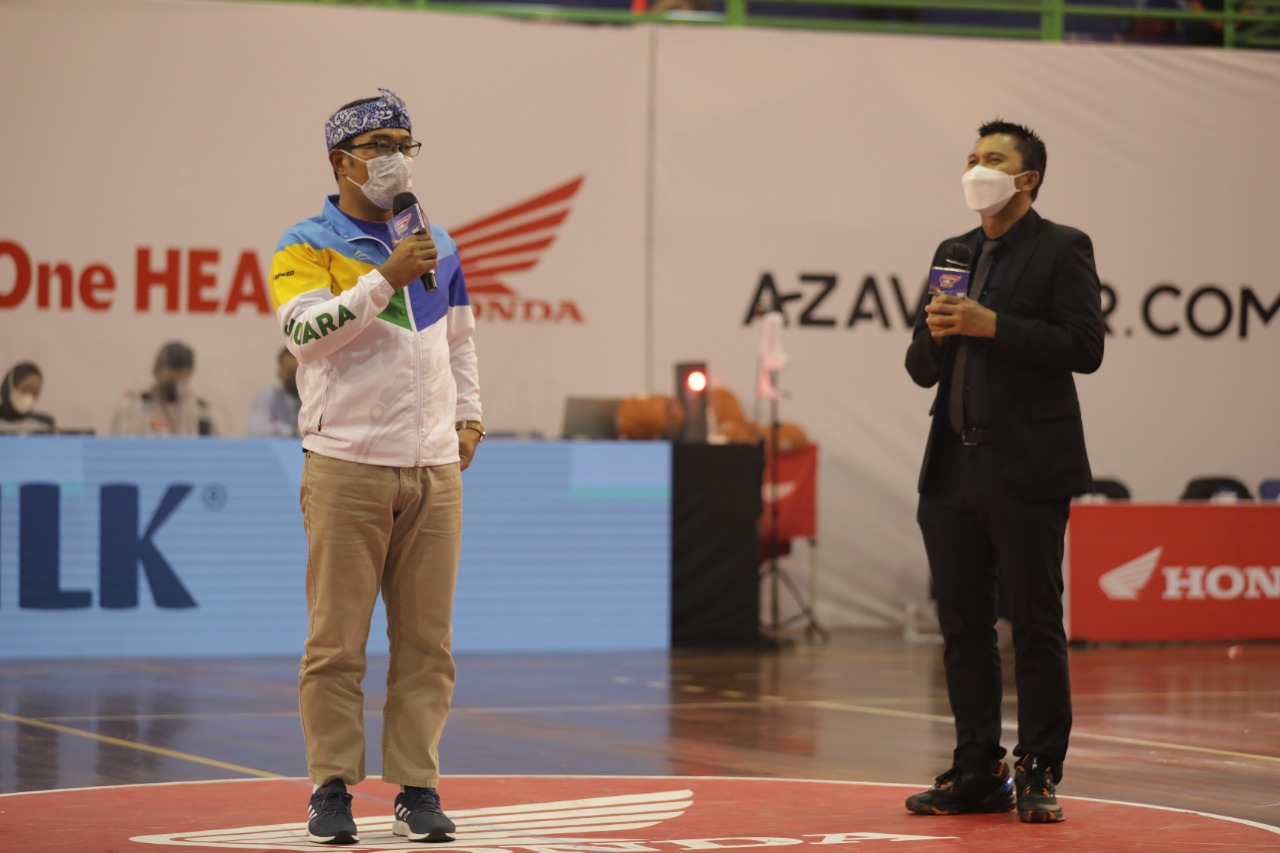 BANDUNG – DBL 2021- 2022 West Java Series menjadi percontohan pertandingan olahraga dengan penonton saat pandemi COVID-19. Gubernur Jawa Barat Ridwan Kamil menutup seri di Sport Jabar, Kota Bandung, Kamis (18/11/2021).