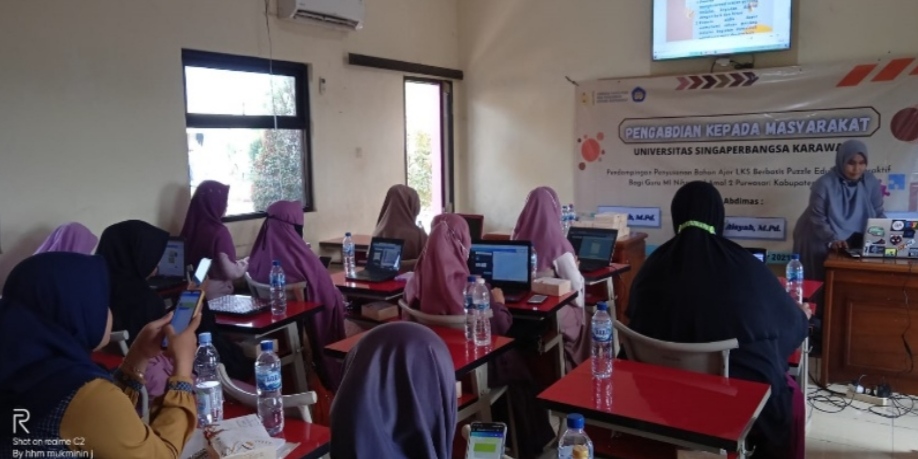 Tim Abdimas dosen Universitas Singaperbangsa Karawang yang beranggotakan Ramlah, M.Pd (dosen Prodi. Pendidikan Matematika), Agung Prasetyo Abadi, M.Pd (dosen Prodi. Pendidikan matematika) dan Dewi Siti Aisyah, M.Pd (dosen Prodi. PIAUD) mengadakan kegiatan pendampingan penyusunan Lembar Kerja Siswa (LKS) berbasis puzzle interaktif kepada guru-guru Madrasah Ibtidaiyyah (MI) Nihayatul Amal 2 Purwasari, Kabupaten Karawang.
