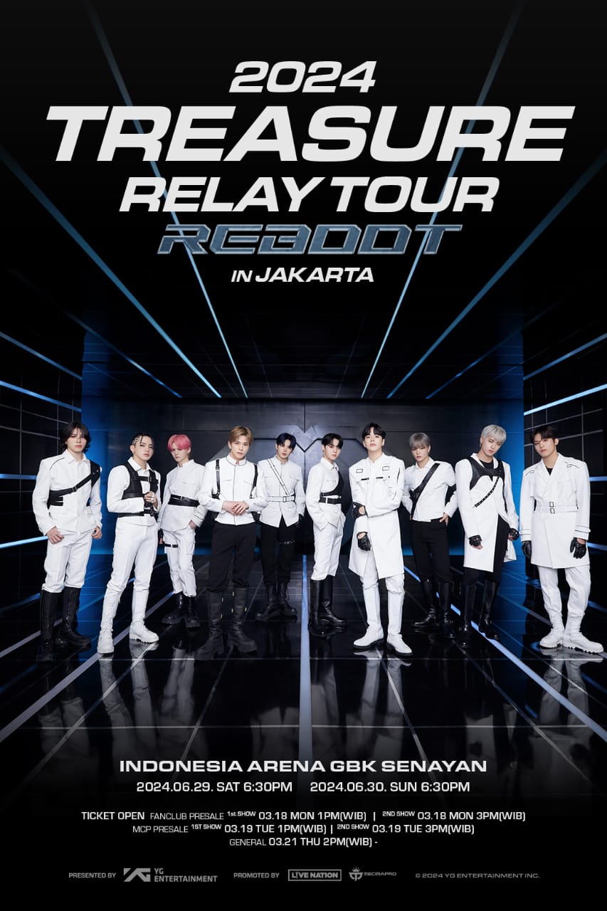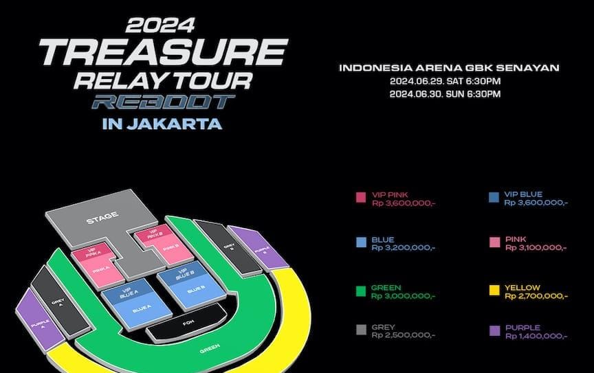 Catat tanggalnya! General Sale 2024 TREASURE RELAY TOUR [REBOOT] IN JAKARTA akan berlangsung pada 21 Maret 2024 pukul 14:00 WIB, dengan harga sebagai berikut: