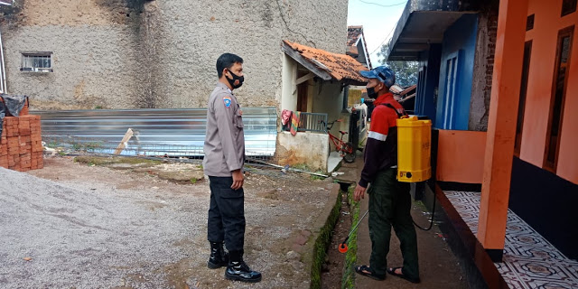 PACET – Bhabinkamtibmas Ds Mekarjaya Bripka Dani Setia Maulana Bersama warga melaksanakan sterilisasi dengan menyemprotkan cairan disinfektan di pemukiman warga di Kp Suaklilah Rw 03 Ds Mekarjaya Kec Pacet. Selasa (21/04/2021).
