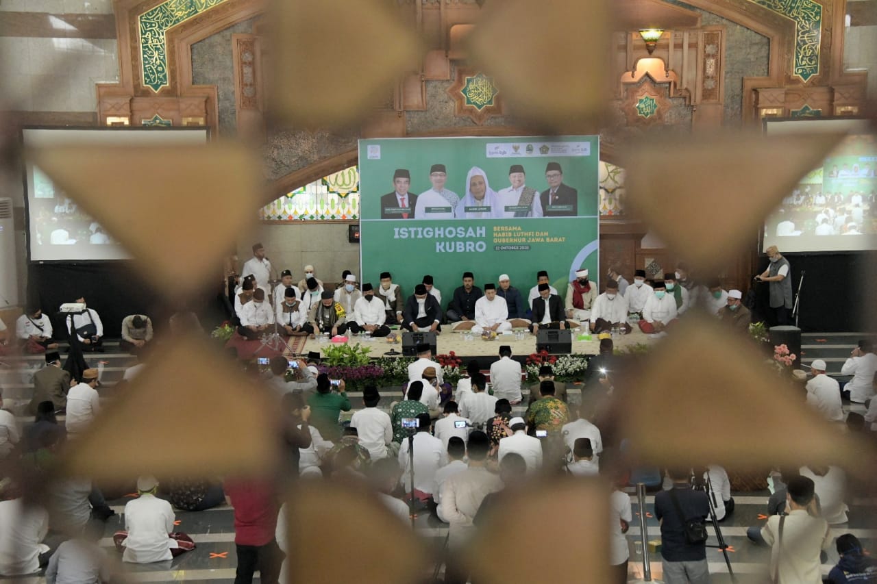 BANDUNG,–Gubernur Jawa Barat (Jabar) Ridwan Kamil, anggota Dewan Pertimbangan Presiden (Wantimpres) Habib Luthfi bin Yahya, dan Forum Komunikasi Pimpinan Daerah (Forkopimda) Jabar, menghadiri istighosah kubro di Masjid Pusdai, Kota Bandung, Rabu (21/10/2020).