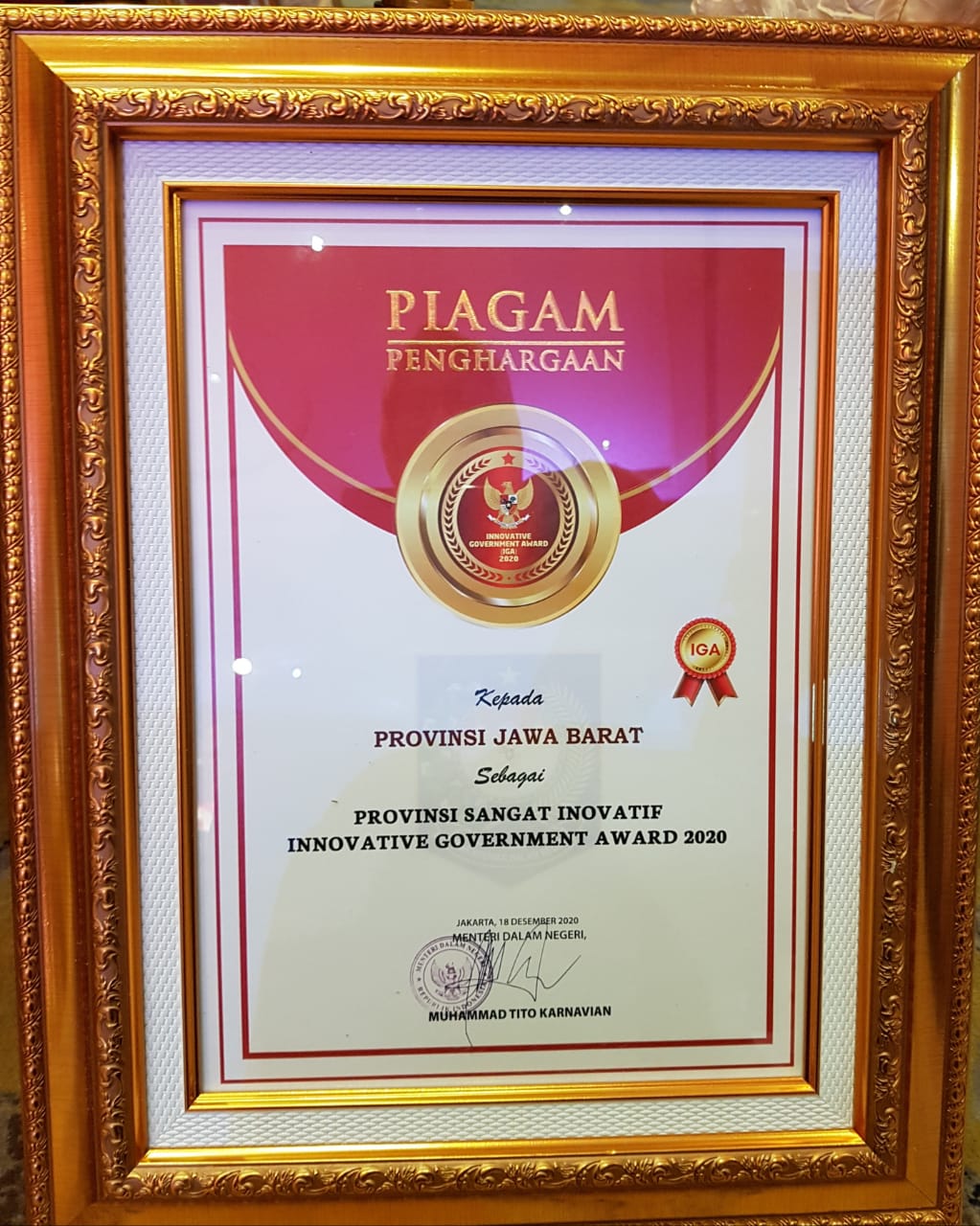 BANDUNG – Pemerintah Daerah (Pemda) Provinsi Jawa Barat (Jabar) meraih anugerah Provinsi Sangat Inovatif dalam penganugerahan Innovative Government Award (IGA) 2020 di Hotel Sultan, Jakarta, Jumat (18/12/2020).