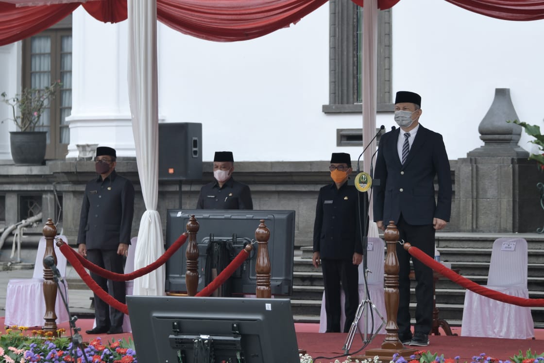 Sekretaris Daerah Provinsi Jawa Barat Setiawan Wangsaatmaja menjadi pembina Upacara Peringatan Hari Bela Negara ke- 73 tahun 2021 Tingkat Provinsi Jawa Barat, di Halaman Gedung Sate Bandung, Senin (20/12/2021). (Foto: Aldien Shubhi/Biro Adpim Jabar)