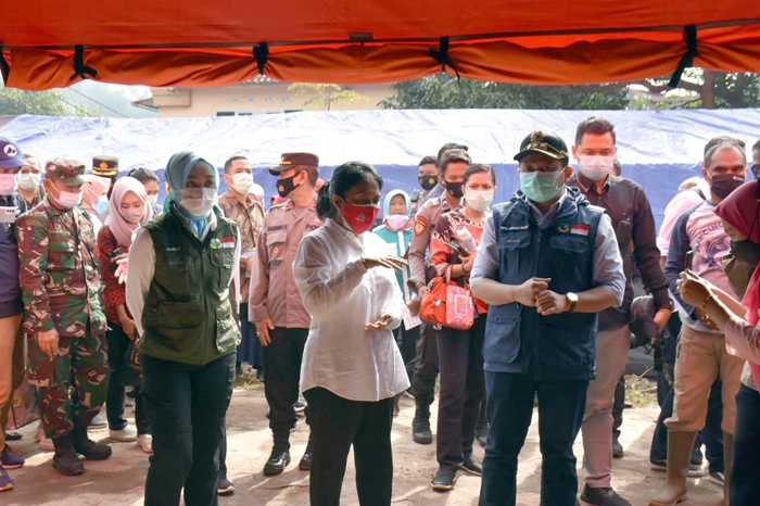 SUMEDANG, — Menteri Pemberdayaan Perempuan dan Perlindungan Anak (PPPA) RI I Gusti Ayu Bintang Darmawati Puspayoga menemui korban tanah longsor Desa Cihanjuang Kecamatan Cimanggung yang berada di Pos Pengungsian Taman Burung Perumahan SBG, Jumat (22/01/2021).