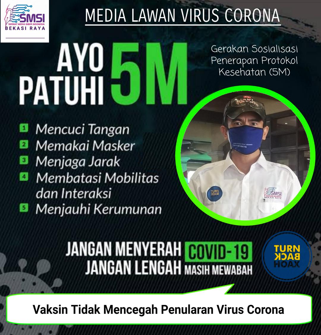 “SMSI Bekasi Raya ikut serta dalam upaya bersama ini untuk membantu pemberian informasi, guna mencegah penyebaran virus Corona di Indonesia melalui gerakan media sosialisasi penerapan protokol kesehatan 5 M,” ucap ketua SMSI Bekasi Raya Doni Ardon didampingi duo uban selaku sekretaris dan bendahara SMSI Bekasi Raya, yakni Leksono Budiarto (Budi Uban) dan Anwar Soleh (Anwar Uban).