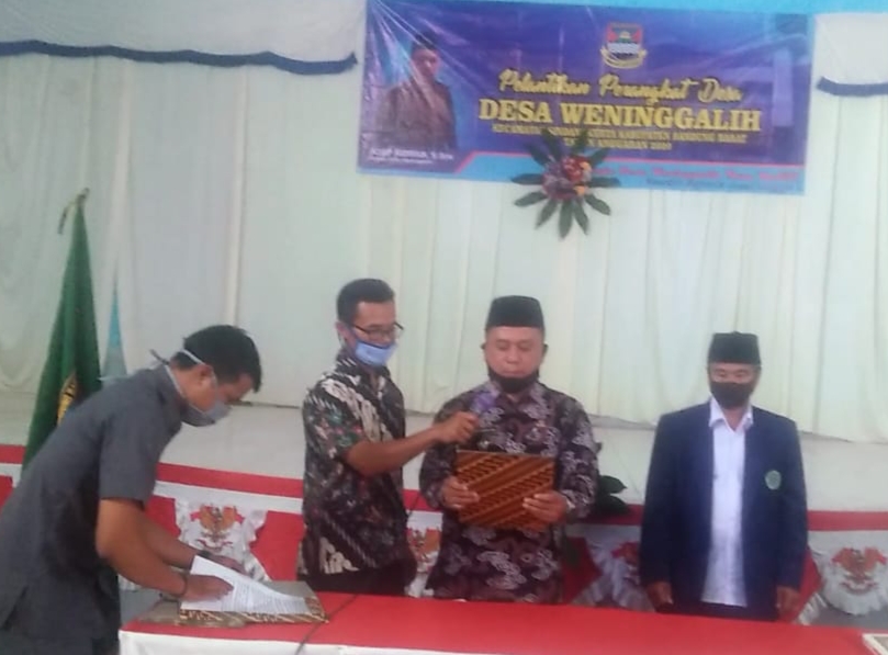 KBB – Kepala Desa Weninggalih Asep Asep Ridwan Lantik Perangkat Desa Weninggalih Kecamatan Sindangkerta Kabupaten Bandung Barat (KBB) Ridwan S.sos melantik perangkat desa yang terpilih dari hasil penjaringan melalui seleksi umum yang di adakan oleh pihak Pemerintahan Desa Weninggalih sejumlah 4 orang yang memenuhi syarat dan akademisi yang mumpuni atas nama Ayub, Neng Siti Purmala, Aris dan Cepi Krida.