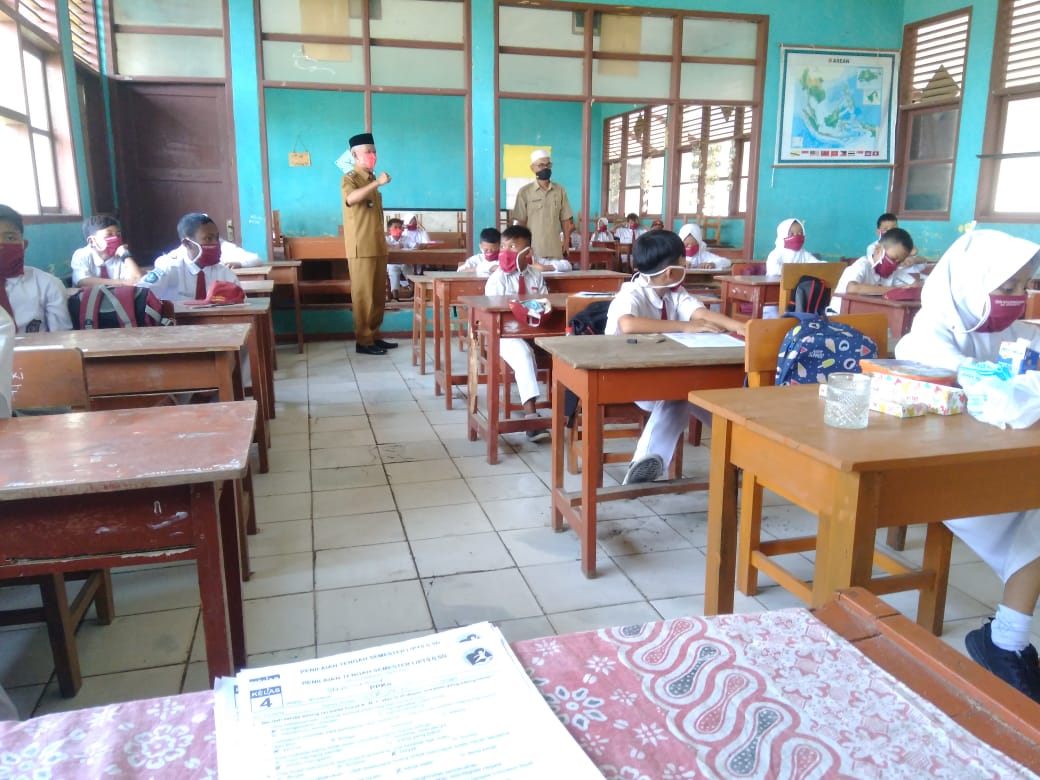 KARAWANG- Ketua Korwilcambidik Kecamatan Rawamerta H Ahmad Kholidin memantau langsung beberapa sekolah untuk memastikan penerapan protokol kesehatan. Salah satu sekolah yang dikunjungi adalah SD Pasirawi 1 Rawamerta, Karawang.