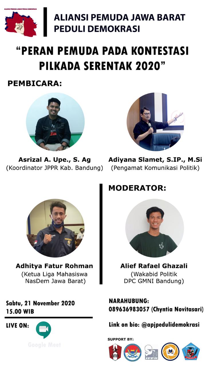 Dengan menghadirkan beberapa narasumber dari pengamat komunikasi politik Adiyana Slamet S.IP., M.Si, juga dari koordinator JPPR Kabupaten Bandung Asrizal A Upe S.Ag dan Ketua Liga Mahasiswa NasDem Jawa Barat Aditya Fathur Rohman, dan sebagai moderator Alief Rafael Ghazali Wakabid Politik DPC GMNI Bandung. Sabtu (21/11/2020).