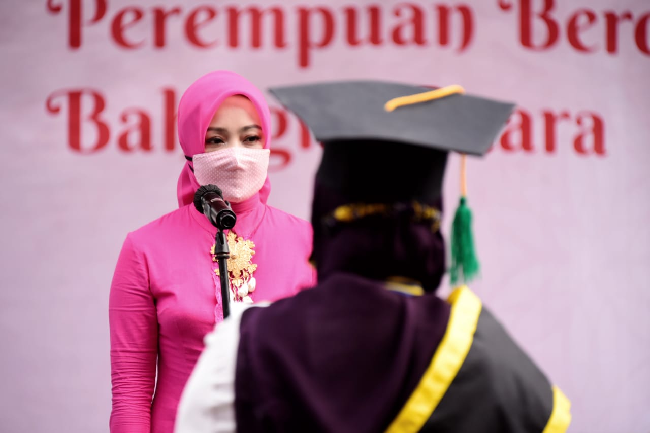 Turut hadir melalui konferensi video Menteri Pemberdayaan Perempuan dan Perlindungan Anak (PPPA) Bintang Puspayoga hadir dalam prosesi wisuda Sekoper Cinta angkatan kedua.