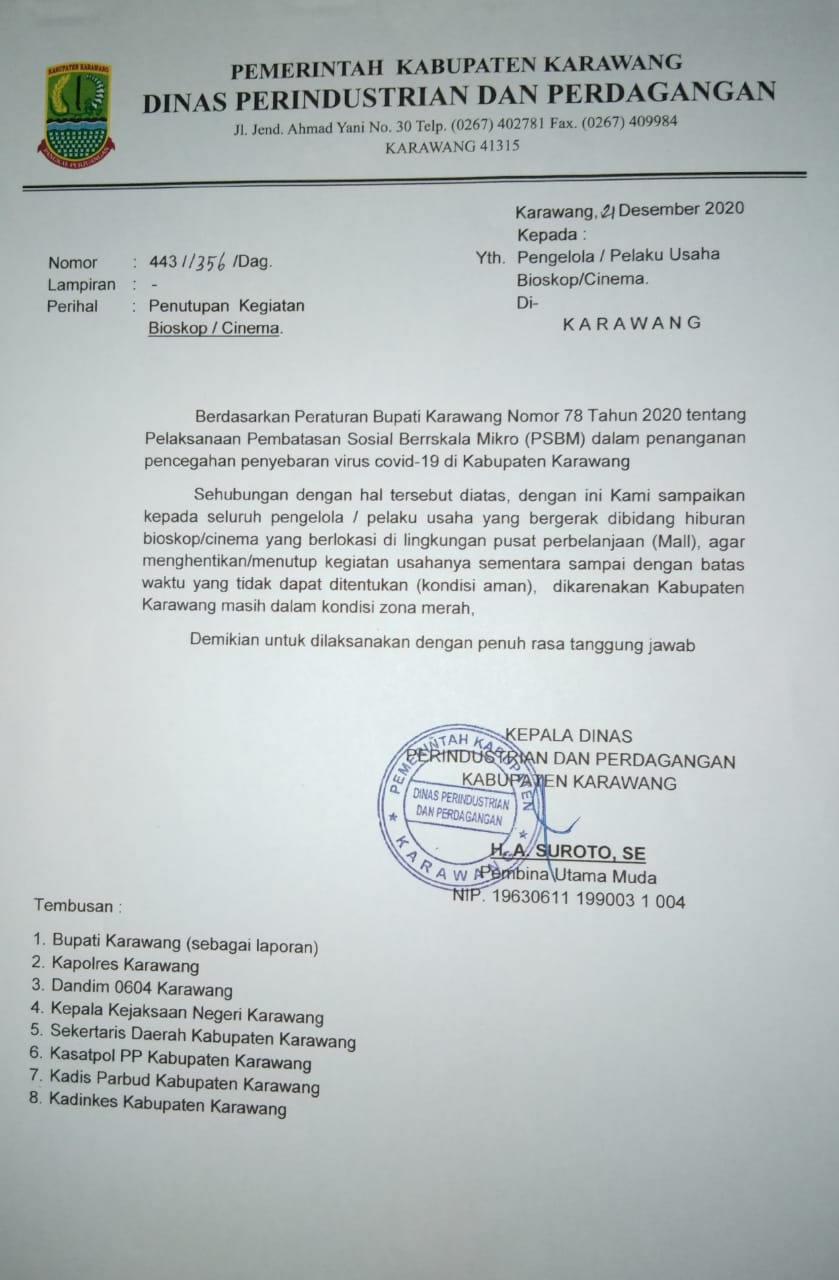 Adapun isi surat terbaru tanggal 21 Desember 2020 itu berisi himbauan agar seluruh pengelola/pelaku usaha yang bergerak dibidang hiburan bioskop/cinema di pusat perbelanjaan (Mall), agar menghentikan/menutup kegiatan usahanya sementara sampai dengan batas waktu yang tidak ditentukan (kondisi aman). Dikarenakan Kabupaten Karawang masih memasuki zona merah.