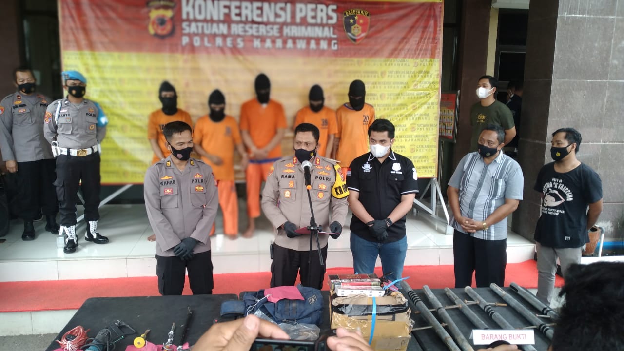 “Identitas tersangka yang kita amankan ada 5 orang yakni, SR (48) dan M (46) asal warga Kecamatan Cikampek, S (32) asal warga Kecamatan Kotabaru, Kabupaten Karawang. Sedangkan 2 pelaku lainnya yakni, CH alias Tebe (23) dan RR alias Kiwong (21) asal warga Kecamatan Darangdan, Kabupaten Purwakarta,” ungkap Kapolres Karawang, AKBP Rama Samtama Putra dalam konferensi pers-nya di halaman Mapolres Karawang, Selasa (23/02/2021).