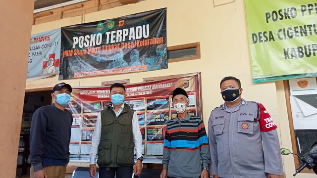 Monitoring kesiapan petugas Ppkm Mikro bersama Babinsa Bripka Dede Wawan Bhabinkamtibmas Desa Cigentur Polsek Paseh Polresta Bandung himbau prokes 5M tetap dijalankan cegah guna penyebaran wabah covid-19,