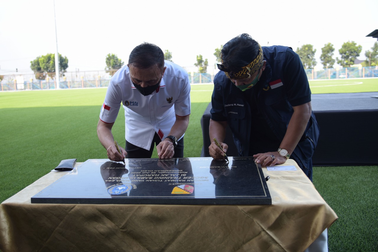 Bandung – Bupati Bandung H. Dadang M. Naser bersama Ketua Umum PSSI M. Iriawan, meresmikan penggunaan Lapang Latih atau Soccer Training Sabilulungan Si Jalak Harupat (SJH).