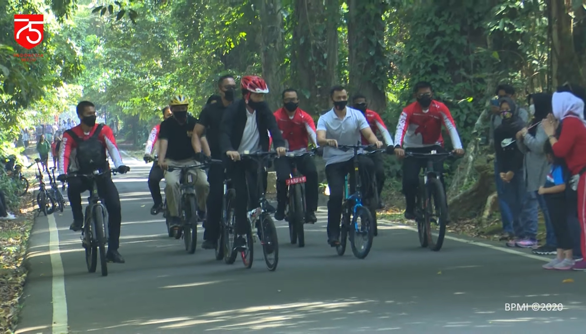 BOGOR–Presiden Joko Widodo gowes mengelilingi Kebun Raya Bogor membagikan masker pada Sabtu, (22/8/2020) pagi. Jokowi tampak didampingi putra bungsunya, Kaesang Pangarep.