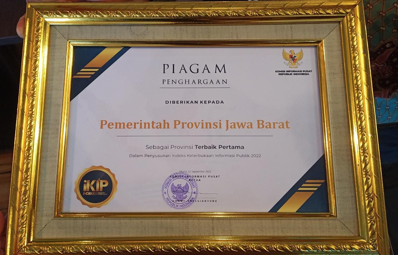 BEKASI – Jawa Barat menerima penghargaan sebagai Provinsi Terbaik Pertama dalam Penyusunan Indeks Keterbukaan Informasi Publik (IKIP) se-Indonesia tahun 2022.